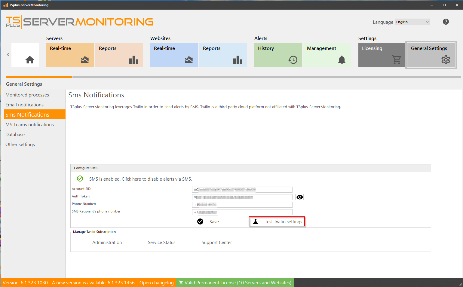 • SMS settings: added a new button to send a SMS in order to test Twilio configuration